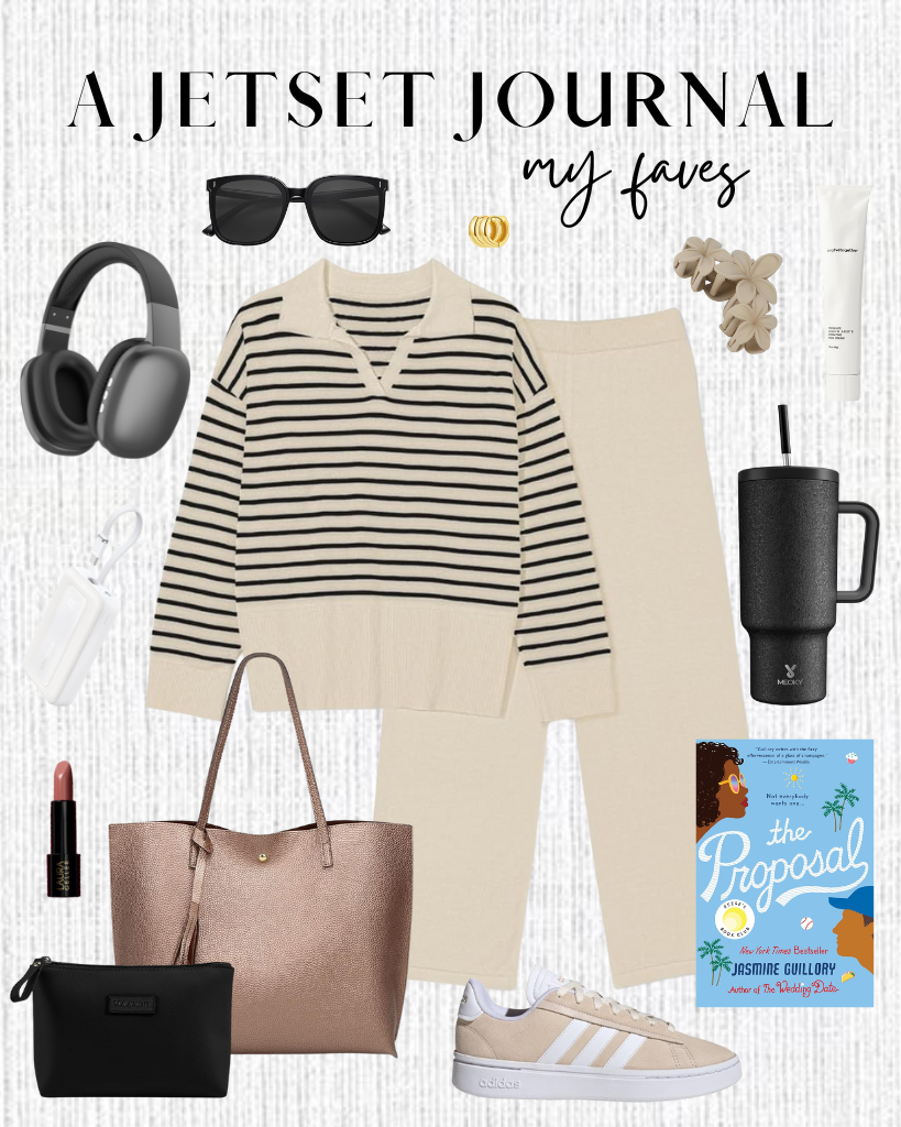 Now for what essentials I put in my tote. I always have a book that I’m reading on hand, currently it’s The Proposal. I have a portable charger for my phone, tablet, or laptop when I’m on the go. I have a mini organizer pouch to put things like my hand lotion, sanitizer, and my Laura Geller lipstick to re-apply throughout the day. Over the ear headphones are something I bring with me to work at a coffee shop, go for a walk outside, or get a workout in at the gym. I love these!