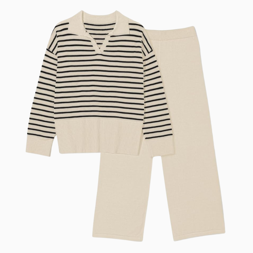 A matching set is always my go to for when I’m working from home or running errands. I love the elevated look of this striped long sleeve top with a collar detail and solid wide leg pants to match. It’s the perfect mix of cozy and giving you a put together look without having to dig through your closet.