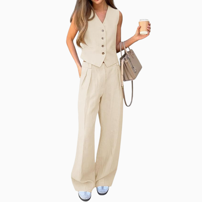 For a super fashionable outfit that you can buy as set, check out these two piece outfit from Cicy Bell. It’s a button down cropped v-neck vest with matching wide leg pleated pants. Looks so professional and elevated!