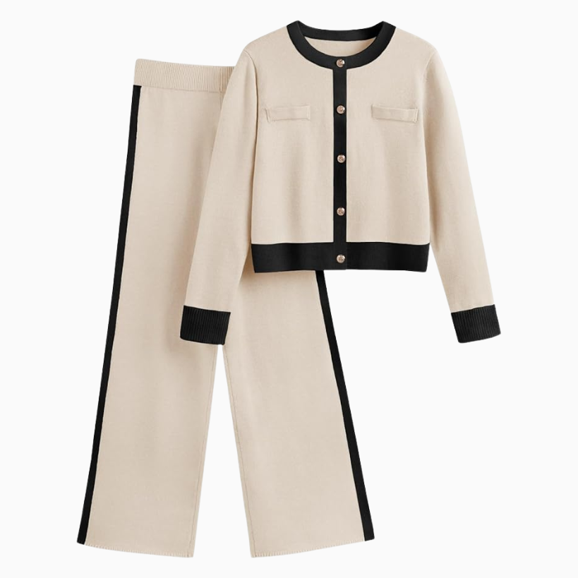 You know that a matching set is always a yes from me. You can easily put an entire outfit together with things from just this post. Start with this two piece set. A cream long sleeve button down cardigan with gold buttons and matching wide leg pants to match. I love the contrasting black hemline throughout the top and bottom of this set.