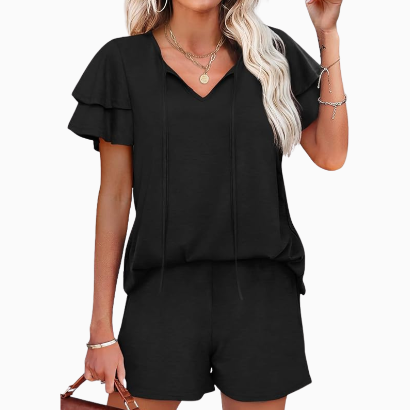 Who doesn’t love a matching set? You can go dressy or super casual with a set depending on what it’s like. For example, this oversized short sleeve tee and matching shorts can be a great loungewear option or something to throw on before running errands. This black ruffled sleeve v-neck with matching shorts is a great in-between option that can be dressed up or down. And this button down sleeveless top with matching shorts is a great elevated set to have for day or night.