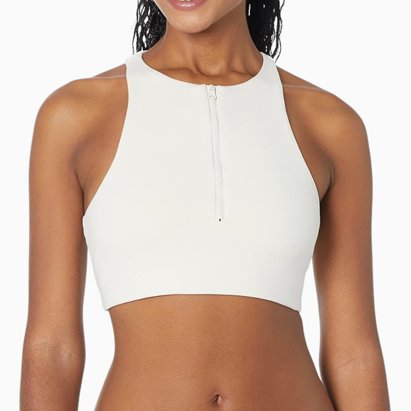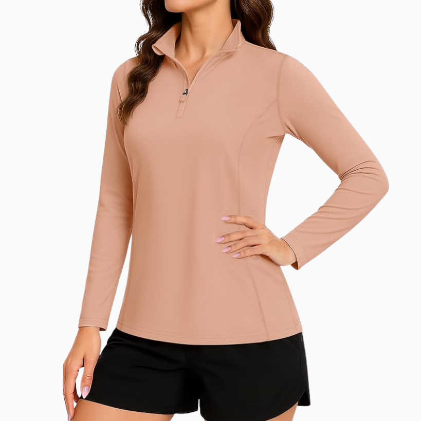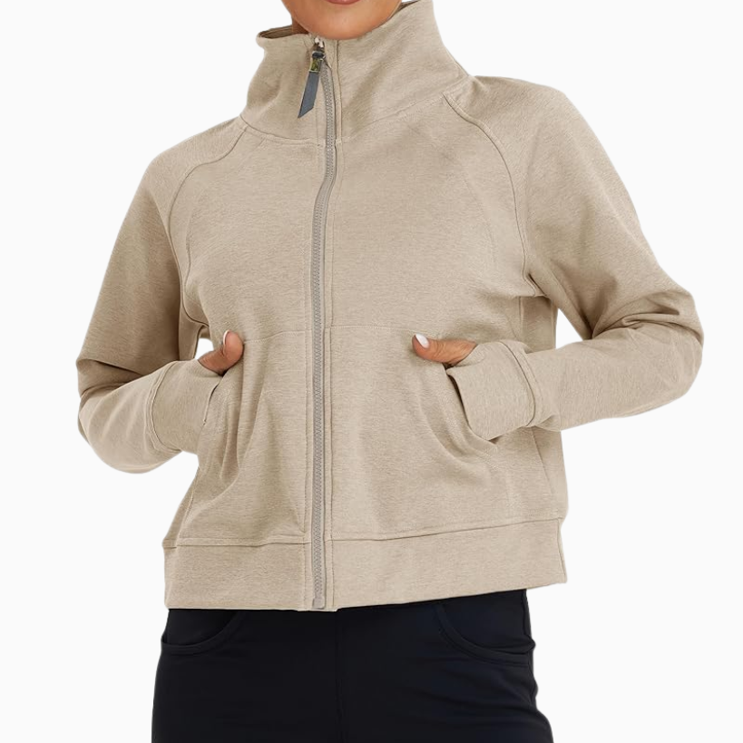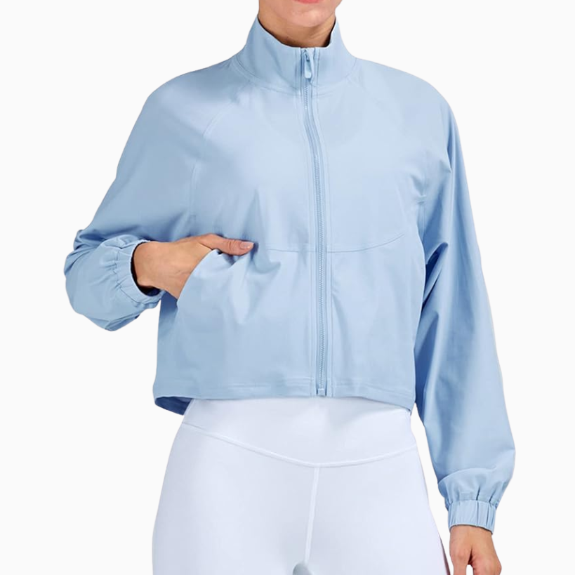 Shop any of these longline cropped tanks or sports bras and throw on a pullover or zip up right over it for an easy outfit. I love this lightweight zip up cropped jacket. The light blue color is gorgeous, and it comes in other colors for you to choose from as well. I also get tons of use out of a quarter zip long sleeve pullover like the one linked below. It’s soft and breathable, you’ll reach for it over and over again.