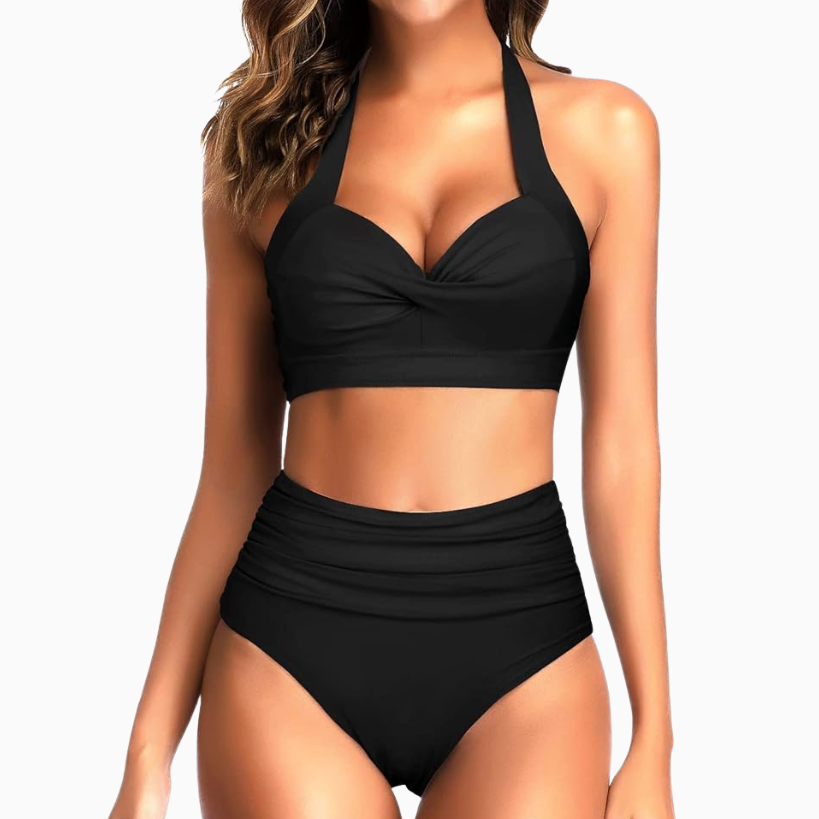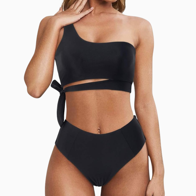 Whether you’re a fan of one piece or two piece swimwear, I’ve got you covered! Some of my favorite two piece styles in this post include the retro halter top with matching ruched high waisted bottoms. Or the one shoulder top with a tie waist detail and high waisted bottoms to match. You can also check out a mix between a bikini and a full coverage one piece by shopping the styles that have a cut out or mesh at the waistline to show some skin.