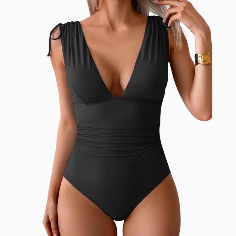 Other details that I love in a swimsuit are these adorable ruffled straps, or this deep v-neck style with thick straps that have a tie detail. Also, any suit that has ruching is SO flattering, and a bunch of these have tummy control which is amazing!