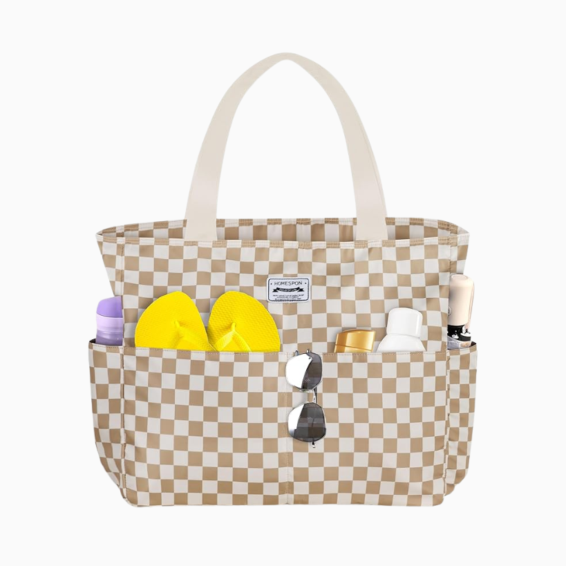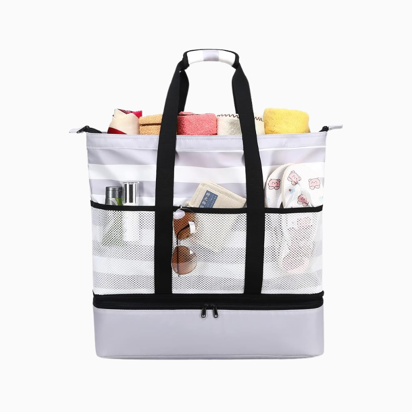 Keep scrolling through all of these bags that are great for your next beach or pool day. You can even keep one in your car, so that if you ever want to do a last minute trip to get some sun and swim you have everything already packed in your convenient bag.