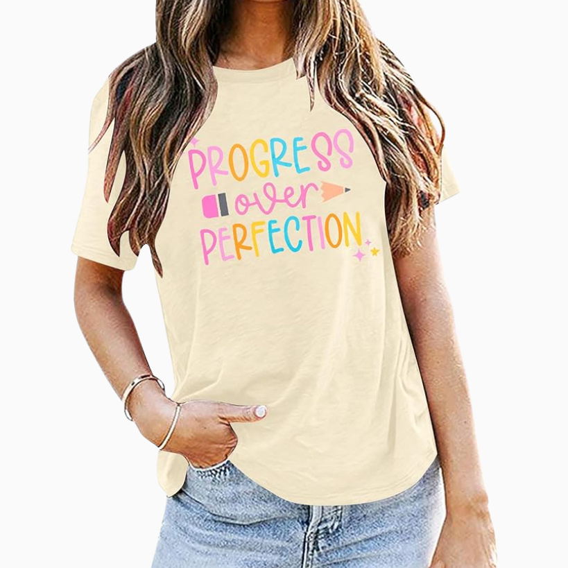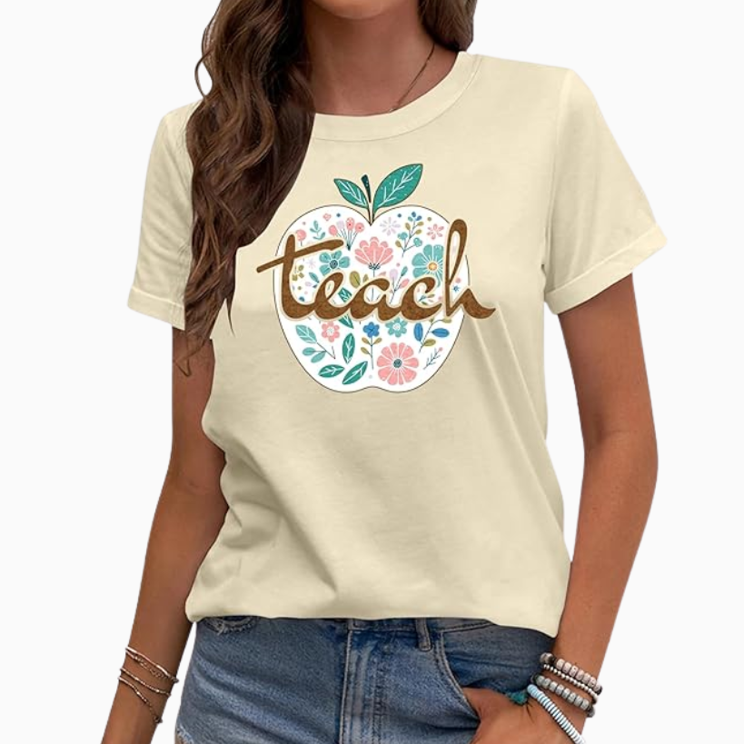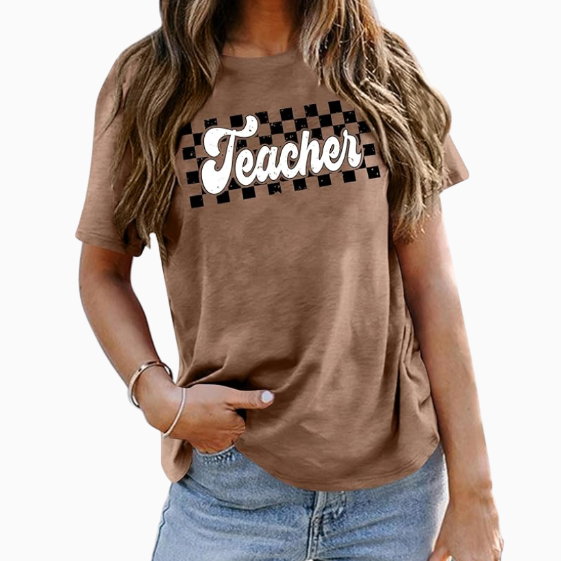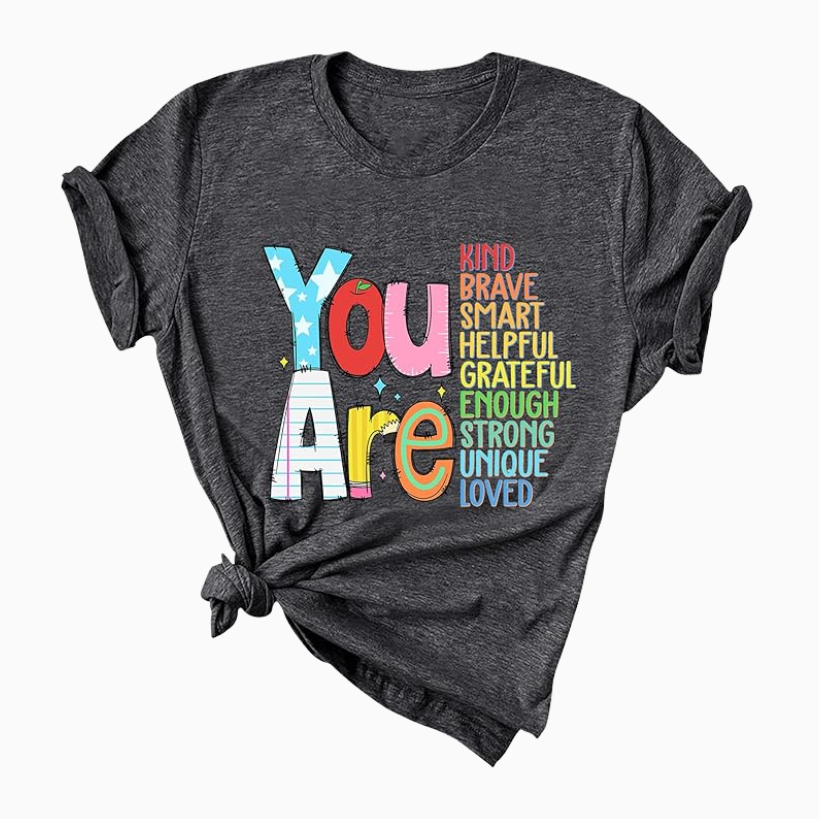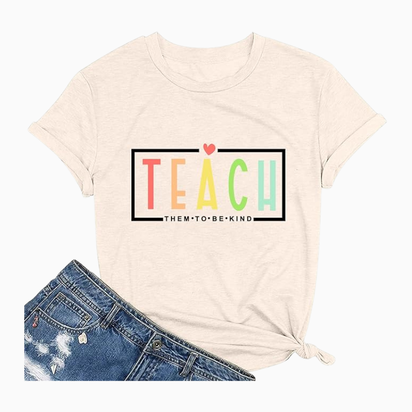 There of course are simple graphics like “Teach” or “Teacher” in various prints colors and patterns. Then there are motivational tees like “Be Kind”, “Progress Over Perfection”, and “You Got This” that can be worn all year long to sport a nice uplifting message to your students.