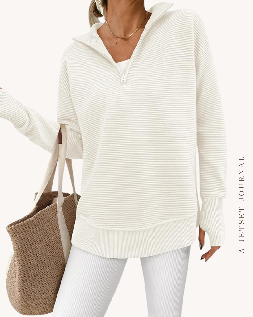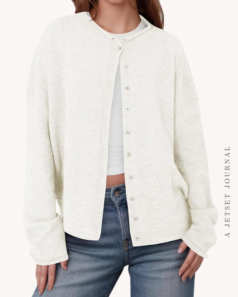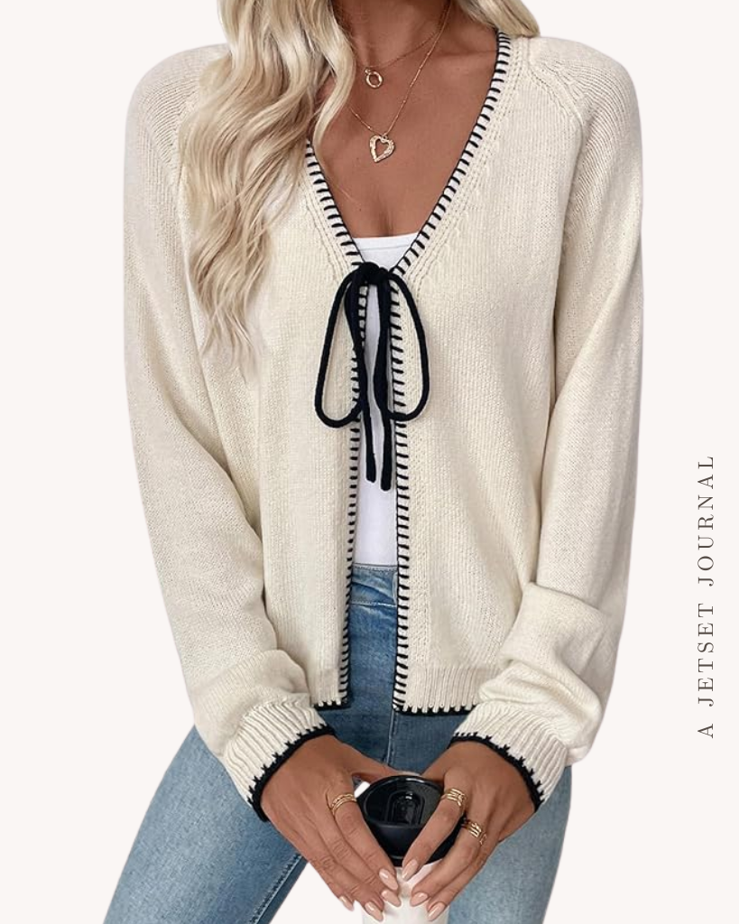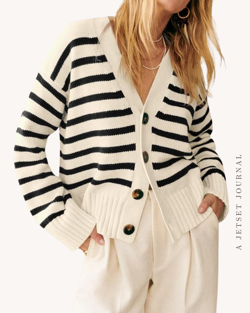 Knit tops are the way to go when the temps get cooler. It can be pullover, a cardigan, a quarter or half zip, whatever fits your vibe. I’m obsessed with this striped cardigan with chunky buttons. I also love the simple open front cardigan that has a delicate bow tie detail in front. There are multiple other tops in here that you will definitely want to add to your wardrobe this season.