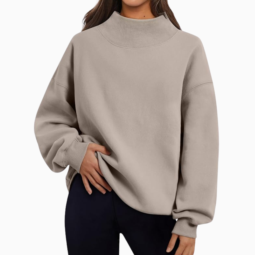 If i want to be comfy but still look a little more elevated than my regular sweats, I’d throw on something like this mock neck oversized pullover and wear it with wide or straight leg pants.