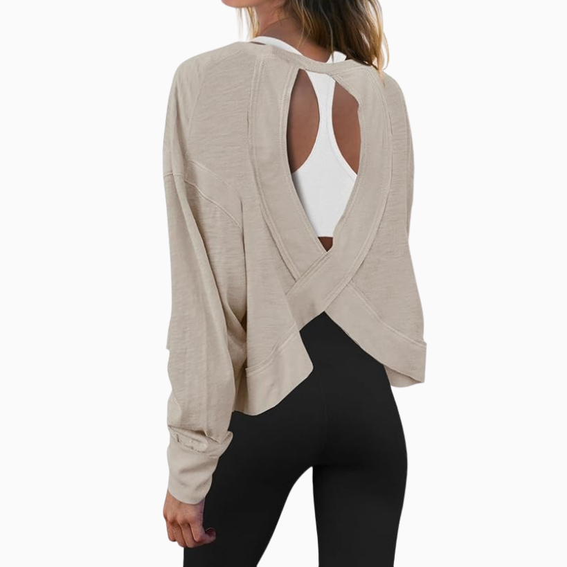 For a workout, I love an open back top. This criss cross style top with an open back is breathable and cute. Wear with your favorite sports bra and a pair of leggings and you’re set.