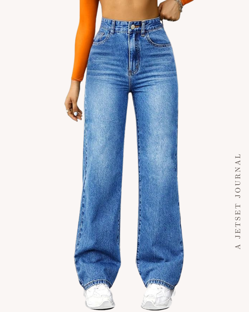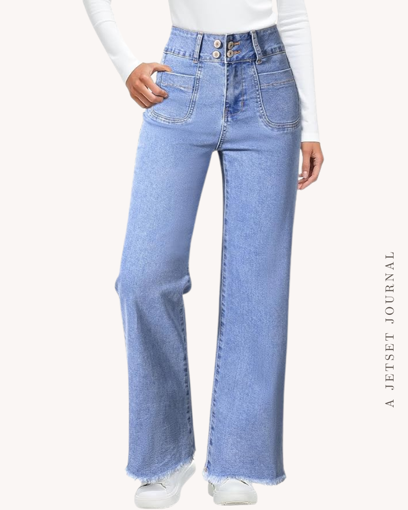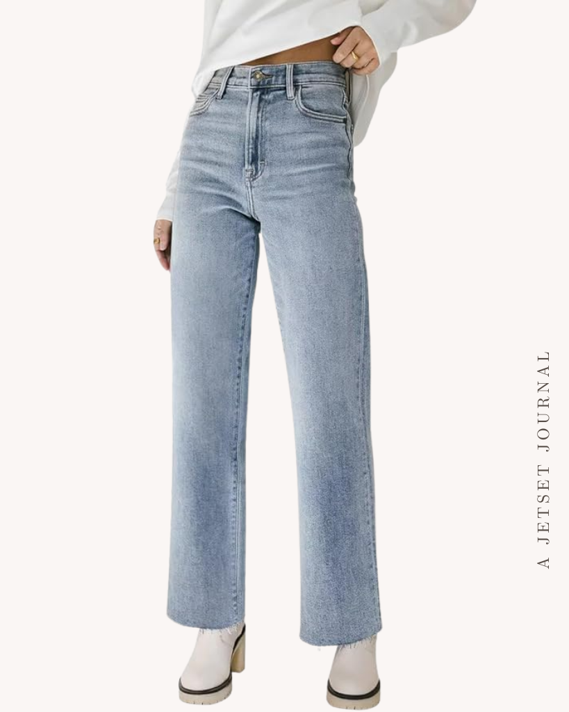 A good pair of jeans is a must have for any time of year! Having a couple different wash options is great so you can match with various tops, too. Like a pair of light wash high waisted straight leg jeans with frayed hem detail. Or a more vibrant blue wash in a high waisted wide leg style that’s super trendy.