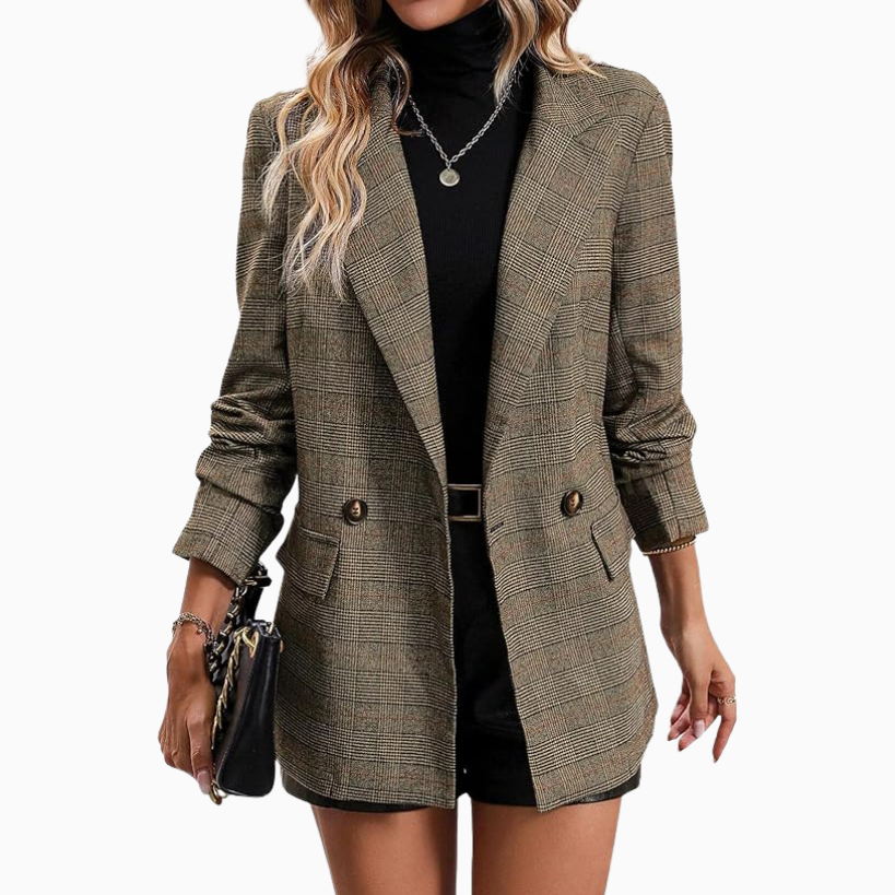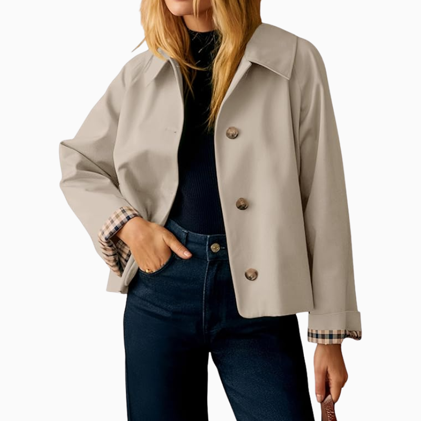 For colder days, you’ll want to throw on a layer before heading out to the office. You want a jacket that’s going to look and feel just as elevated as the outfit that’s underneath. I’m in LOVE with this cropped trench coat. It’s got big chunky buttons and a checkered lining, both which make this jacket totally look like it could be designer.