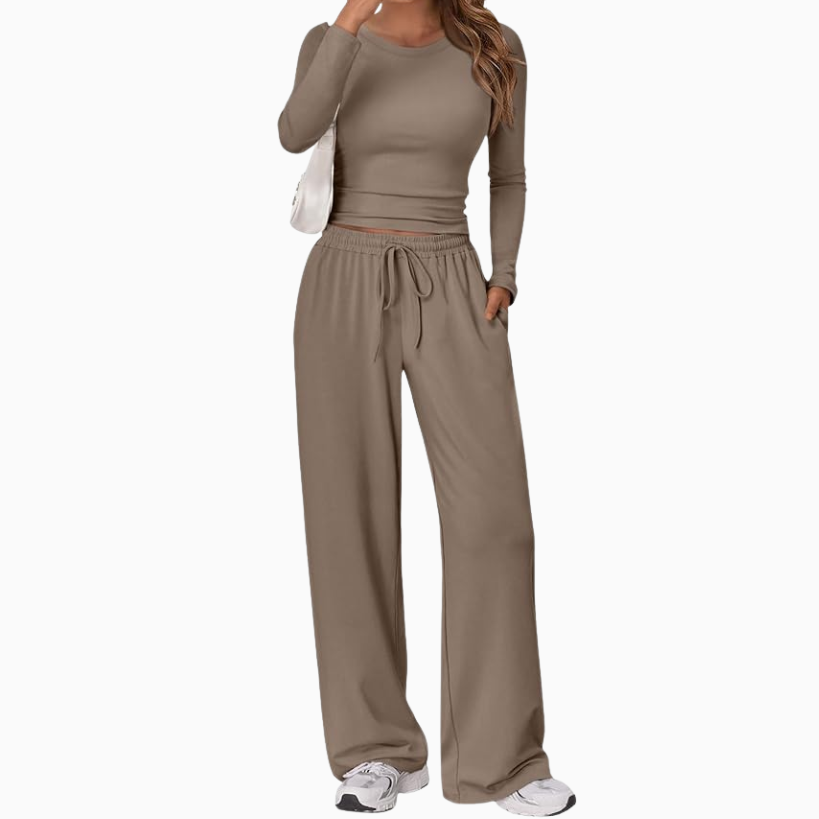 Get a completed set, like this fitted long sleeve and matching wide leg pants set that comes in a variety of colors, or you can put together your own set by pairing some of the tops and bottoms in this post with colors that go well together.