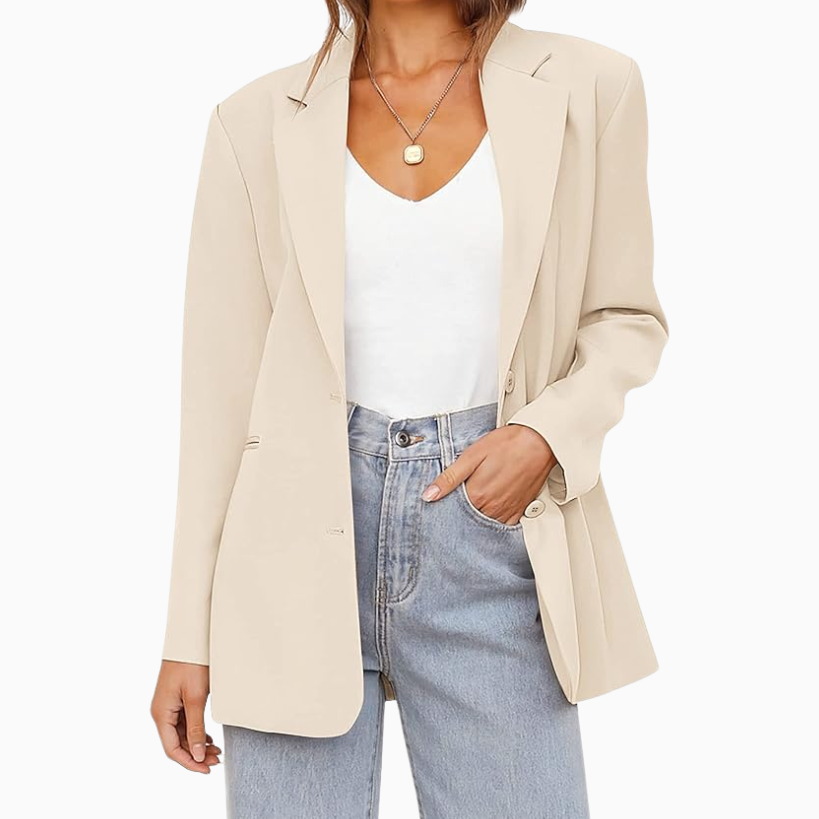 Another essential is a blazer that fits really well and matches with lots of outfits. This neutral blazer is perfectly oversized yet still gives you a shape. It’s soft and easy to wear all day long without feeling constricted.