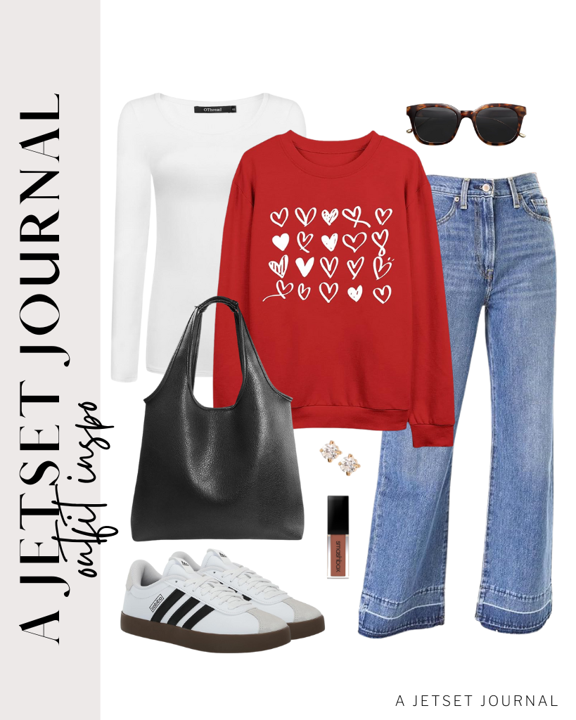 Outfit 2: Layer this red crewneck with white hearts over a white fitted longs sleeve and wide leg jeans. Style with classic adidas sneakers and a black soft shoulder bag to match. Finish the look with classic sunglasses from SOJOS.