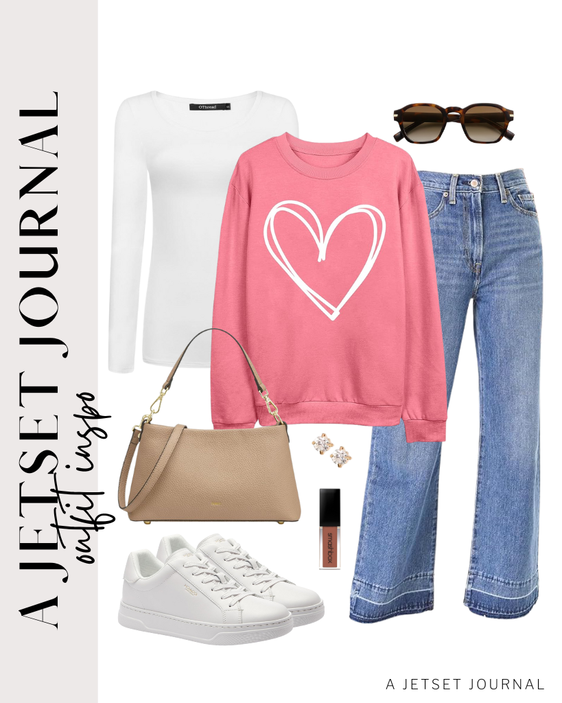 Outfit 1: Start with a plain white long sleeve top and high waisted jeans. Add this light pink crewneck with a colorful heart graphic. Then style with white Steve Madden sneakers and a neutral slouchy hobo bag. Complete this outfit with oversized brown sunnies.