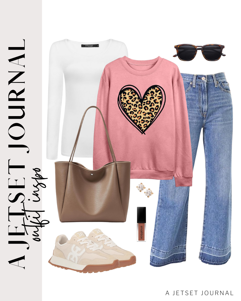 Outfit 5: How fun is this pink sweatshirt with a leopard print heart on it? Love how it looks over a white long sleeve and with a classic pair of high waisted wide leg jeans. Style with neutral Sam Edelman sneakers and a tote bag. SOJOS Polarized Sunglasses complete this outfit.