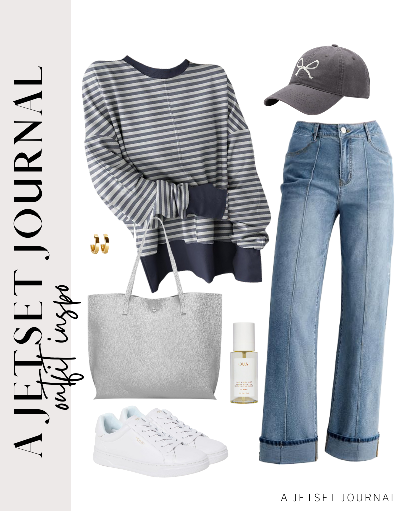 Outfit 3: I love stripes, and the colors of this sweater look so cute with these wide leg cuffed jeans. Style with chic white sneakers from Coach and a light neutral tote bag. Complete the outfit with a gray baseball cap to match your sweater.