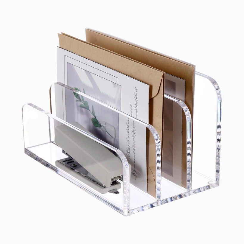 Decorate your space with things that are functional and practical. Get an acrylic organizer for important paperwork and folders. A table lamp to give you some nice light while also elevating the space. And how cool is this bluetooth speaker that looks like a retro style radio? I love it! A clock is another practical decor piece that you can get to match the room and also check the time throughout the day.