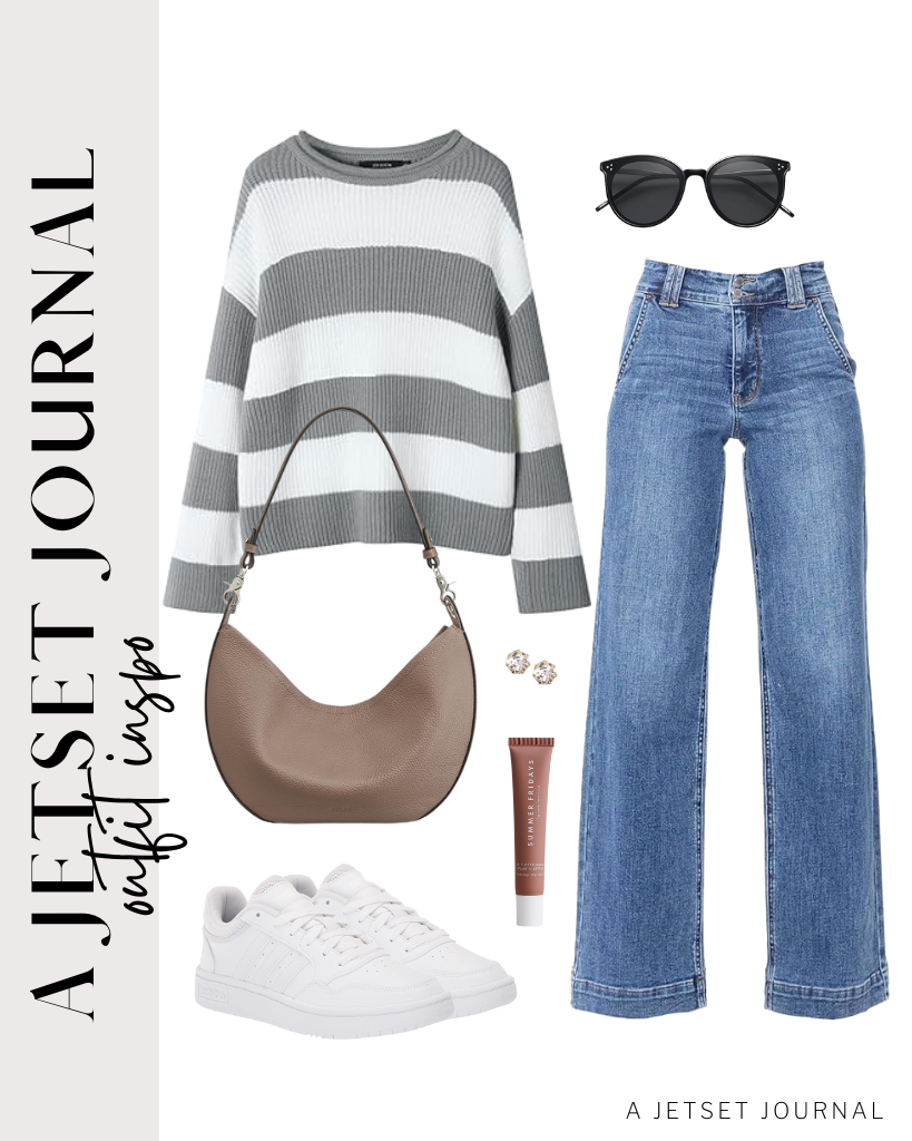 Outfit 2: Start with a gray and white striped crewneck and wide leg jeans. Grab a pair of classic white sneakers from adidas and a neutral shoulder bag. Finish off with round sunglasses.