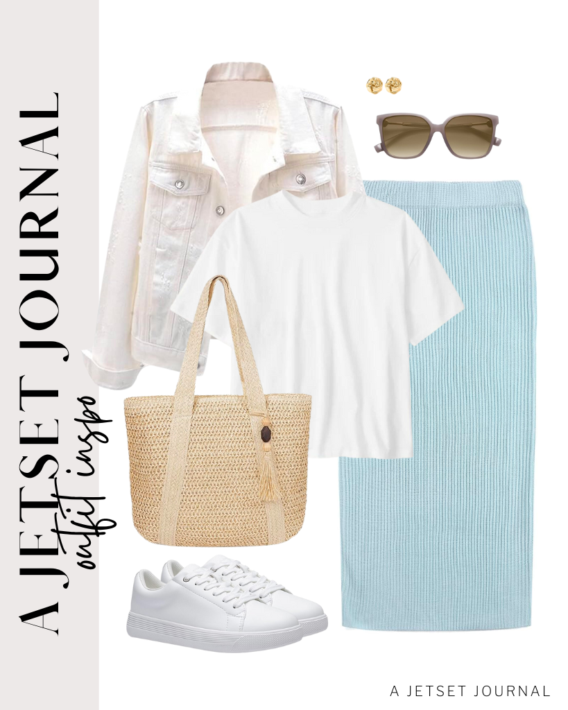 Ribbed Midi Skirt / Basic Short Sleeve Cropped Tee / GAP Women’s Icon Denim Jacket / adidas Sambas / Straw Tote Bag / SOJOS Retro Polarized Aviator Sunglasses / PAVOI 14K Gold Plated Love Knot Stud Earrings